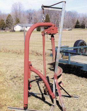 To release the auger from the tractor, I just back up the post hole auger and attach the chain to a swivel-type metal loop welded on top of the auger's mounting arm. Then I detach the auger from the tractor's 3-pt. hitch and lower the auger until it dangles above the ground. (Joseph L. Bellor, 2578 Reed Rd., Lapeer, Mich. 48446 ph 810 667-2854)
