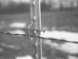 According to the Voltaire, N. Dak. inventor, the Fencer's Pretzel easily fastens to any "studded T" or "ripple T" steel post using commonly available T-post staple clips.