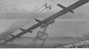Handy Overhead Hoist FARM SHOP Miscellaneous 31-1-36 Rob Sharp, Watford, Ontario: "I came up with a handy overhead hoist and wheels in my shop using a section of barn door track that I bolted to the ceiling. The track is welded to 18-in. lengths of angle iron that are spaced 2 ft. apart and bolted to the ceiling joists. Two sets of wheels are mounted on a 14-in. spreader bar to distribute the weight over a larger area of track. I paid $25 for the track, which I bought new, plus about $20 for the wheels. A big benefit is that it doesn't take up a lot of headroom in my shop, which has a low 9-ft. ceiling. The track hangs no lower than the ceiling's fluorescent lights. The hoist can lift loads up to 500 lbs. or more.