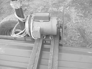 The saw is set up on a 2-wheeled, home-built trailer and is powered by an electric motor that has a 16-in. blade bolted to it. The motor is bolted to a small metal carriage that's free to ride between a pair of channel iron guides. To change the cutting angle the operator simply loosens a set screw.