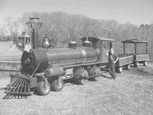 The locomotive is painted red, silver and black and is complete with a cow catcher on front, as well as an antique bronze bell off an old fire wagon, a big headlight, and a big stainless steel smoke stack. It pulls a 4-wheeled car and caboose that can hold up to twelve kids at a time.