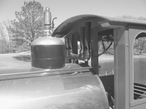 An air compressor that's belt-driven off the engine supplies air for the locomotive's whistle. It's made out of four 1 1/2-in. dia. pvc pipes of different lengths to provide the right sound. Air from the compressor goes to a pair of air tanks located above the front wheels.