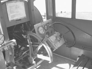 The locomotive's running gear consists of two hydrostatic transmissions, rear axles and wheels - one set off each pecan sweeper - that are bolted together to provide 4-WD. There are four smaller caster wheels on front for steering. One of the sweeper engines, a V-4 Wisconsin, was rebuilt and is used to chain-drive a hydraulic pump that powers both transmissions. The transmissions are controlled by two levers that are tied together inside the cab, allowing Rowell to operate both transmissions with one hand. (Each lever goes to a separate hydrostatic axle.)