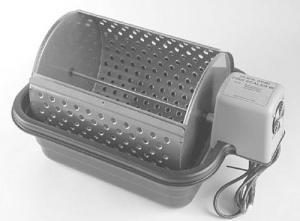 The electric-operated Slick Skin Fish Scaler III measures 29 in. long by 19 in. wide and weighs 25 lbs. It consists of a stainless steel drum with a large door for easy loading and unloading of fish. A shaft inside the drum rotates a de-scaling device. Large holes in the drum allow the scales and slime to wash away from the fish and into a poly tub partially filled with water.