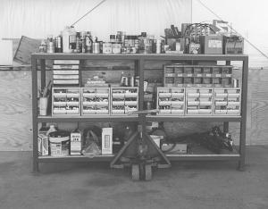 • Nuts and bolts storage rack. It holds Hach's nut and bolt rack and many other items. Made from 2-in. rectangular tubing and with bolted-on plywood shelves, it measures 8 ft. long by 32 in. wide by 53 in. high.