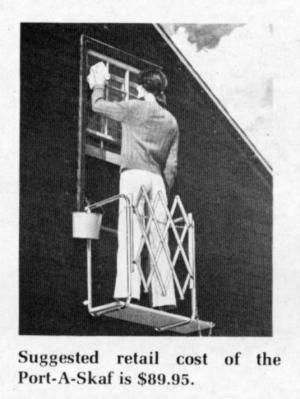 It installs in seconds from inside and fits most windows. "Just push the lightweight Port-A-Skaf out from inside your window, step out onto it, hang a bucket of water on the convenient hooks and your're ready to wash the outside window. Both hands will be free," James Barren, of Distributor Sales, points out. The Port-A-Skaf can also be used on first floor windows to avoid damaging plants. It folds flat and expands or contracts to fit the width of each window.