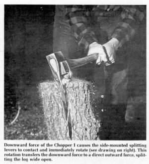 "Once you use it, you won't be satisfied with anything else," says the manufacturer of the Chopper 1, claimed to be "the first new development in wood splitting since the invention of the axe". "It's stick-proof and will split most logs with a single stroke," according to Tony Rotondo, of Chopper Industries. Splitting levers built into the sides of an ordinary axe head do the work. "With these splitting levers, the Chopper is 3 to 4 times more effective than wedges, mauls or other types of axes," he explains. "The levers prevent the blade from sticking. Consequently, if the first strike fails to split the log, the Chopper is free and easy to raise up for a second swing to finish it off." Cost of the new Chopper 1 is $29.95, plus $3 for shipping and handling. For more details, contact: FARM SHOW Followup, Chopper Industries, Box 87, Easton, Pa. 18042 (ph 215 252-3562).