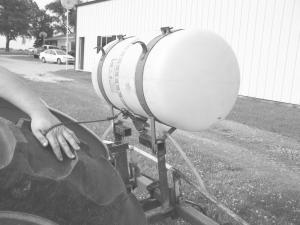 "I got the tank from my uncle's junked 4-row Deere planter, which originally had two 55-gal. tanks on it. Two tubes extended down from the bottom of each tank, one on each side. An actuator valve opened and closed the restrictor valves automatically as the planter was raised or lowered. I installed a handle on the actuator valve, which allows me to reach back from the tractor seat and open or close the valve manually."