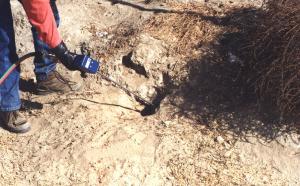 Here's how it works. The wand is inserted into a tunnel, then the opening is covered with soil around the wand, and the fumigant injected. The material injects in liquid form, then turns into a gas that's heavier than air so it moves quickly down the tunnels and dens, suffocating the animals as it spreads. It then quickly breaks down.