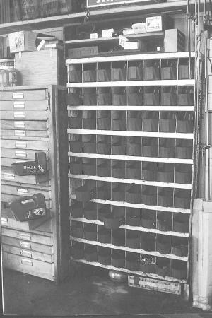 Mark Snider, Cle Elum, Wash.: "My storage system for nuts and bolts was simple to make from scrap wood and old oil jugs. There are 72 separate compartments, each with a slide-out jug (cut down as shown at left in photo). Each compartment is 8 1/2 in. deep and 7 in. high. There are 1/8-in. saw cuts every 5 in. Pieces of 1/8-in. plywood are inserted into the cuts for vertical dividers. Narrow 1 1/2 by 3/4-in. strips of wood nail to the front of each shelf as stiffeners and to keep the jugs from sliding out too far. The wood strips are nailed to each shelf, positioned so they're even with the shelf above and extend down into the compartment below. When you pull the jug out it hits the stop, but you can tip it up to take it out."