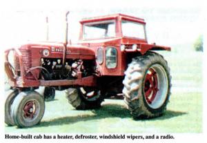 "The cab has a heater, defroster, windshield wipers, and an AM-FM radio. We used box steel tubing to make a rollbar for the cab, then added sheet metal and glass windows. The two doors on back can be lifted off and all the windows crank out. We added a hand-operated throttle that makes it easier to unload forage wagons from the ground."