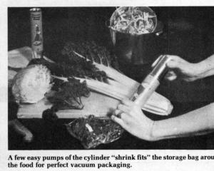 Thanks to the new Freezer Vacuum Pump, there's an easy, safe and inexpensive way to remove this trapped air from inside freezer storage bags. A few easy pumps of the cylinder is all it takes to "shrink fit" the storage bag around the food for perfect vacuum packaging. It can also be used for packaging non-frozen foods for storage. "It will do everything from retaining the fresh crunch in your breakfast cereal to neatly and compactly storing woolen sweaters and other garments without the need for moth balls," says Lovero.