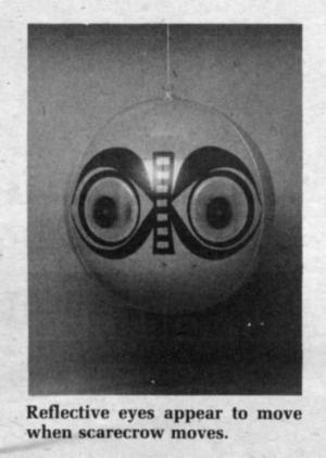 The balloon-like scarecrows can be used around farm buildings, orchards, gardens, livestock, and in fieIds. Each ball controls an area from 60 to 150 ft. radius around it, depending on its size. The new scarecrow is being used primarily on farms in Japan but is also in use around public buildings, railway stations, religious shrines, and airports. The ball can be hung from the end of a pole set up in the field. Some farmers string wires over crops and space the balls out over them.