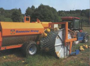 The company's "pumpkin plow" is a V-shaped front-mount blade that moves pumpkins into windrows. Then the harvester runs down the rows. A large wheel fitted with sharp spikes pokes into the pumpkins, lifting them up to be dumped into a wagon hopper.