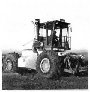 Power comes from a turbo-charged Cummins 6-cyl. in-line engine. The hydrostatic transmission consists of four separate Sauer pumps that supply oil to Poclain motors mounted on each wheel. Each pump and motor work independently but a sensor monitors wheelslip. If detected, oil flow to that wheel is automatically shut off but in-creased to the others. A single joystick controls the transmission. You simply push it ahead to go forward and back for reverse. Speed ranges from 0 to 18 mph.