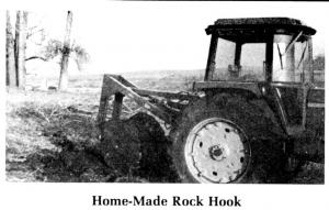 His home-built rock hook uses two hydraulic cylinders - one to raise and lower the rear portion, and one to move an arm against the rock so it can be carried. "The cylinder on the top link, used in combination with the 3 pt. hitch, gives the unit more of a prying action than the 3 pt. only," Foslien explains. Removable points allow rocks