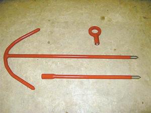 The tool consists of 5/8-in. cold-rolled rod, bent to an "anchor" shape. One long end of the rod has coarse threads sharpened to a point, so it easily pushes into the blockage of hay in the pickup.
