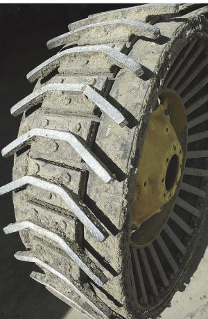 "The combination gives a smoother ride and better traction than with traditional steel wheels," says Nolt. "It causes less damage to the cleat and none to the road. The rubber belting provides ęgive' to the cleats so they level out on the road."