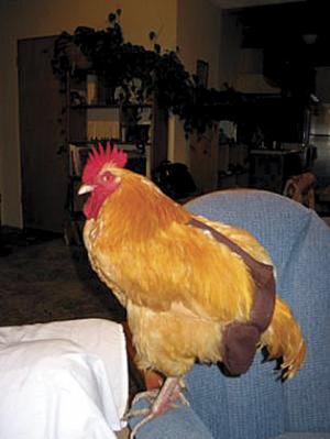Haldeman's diaper design features a cloth band that fits over the tail knob and feathers. Chicken droppings are captured in a disposable plastic liner held in place by the band. The diaper's weight is carried on the back of the chicken, and it doesn't interfere with normal preening.