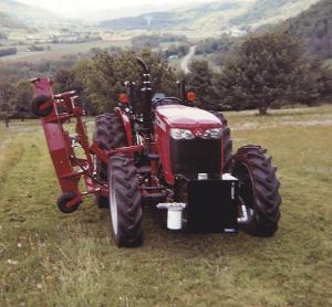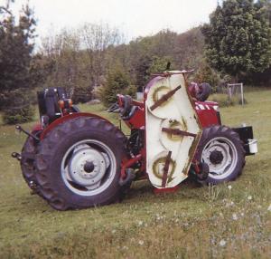 "Moving the mower to one side of the tractor makes it fun and easy to operate," says Van Dam, "and I can see everything well without having to look back. My Massey Ferguson 2625 tractor has power steering so I can turn the mower around on a dime. Also, with the mower on the side I can use it to cut grass over gullies where a 3-pt. mounted model couldn't go."