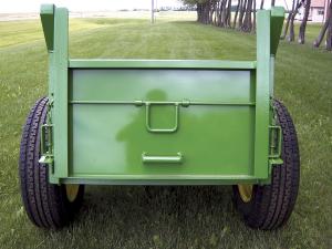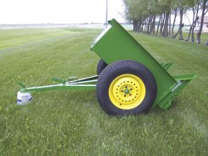 The trailer's box measures 30 in. wide by 40 in. long by 16 in. high and is made from 11-ga. steel. The box mounts on a frame made from 3/16-in. tubing and comes with a spring-loaded latch. When released, the box manually tilts overcenter. An air dump model, which uses a 12-volt air compressor to operate an air bag, is also available.