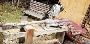 "It's the safest way I can think of to cut up small branches and trees," says Kenneth Gustafson, Carney, Mich., who uses an electric-operated, 10-in. miter saw equipped with a 10-in. carbide-tipped blade to cut small chunks of firewood.