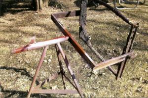 The wheel holder mounts on a tripod and is made out of 2-in. dia. pipe that rides inside a short length of 2-1/2 in. dia. pipe, which allows the wheel holder to rotate. An adjustable crossbar on top of a rectangular metal frame is used to hold the wheel tight. It'll hold wheels from 8 to 16 in. dia.