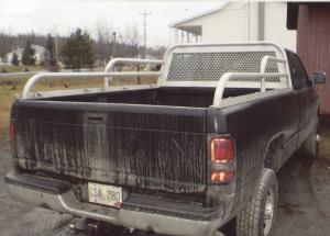 The rack is built from 1 1/4-in. dia. schedule 40 aluminum pipe and 2 by 3 by 1/4-in. thick aluminum angle iron, with an aluminum expanded mesh rack protecting the cab's rear window. The rack bolts to the top of the bed sides with four 1/2-in. bolts. My home-built rack is built solid and cost only about $300 to build. I work at a local shipyard so I was able to get the materials for cost. (Larry Genge, 134 Main St. N., Glovertown, Newfoundland, Canada A0G 2L0 ph 709 533-2798; l_dgenge@yahoo.ca)