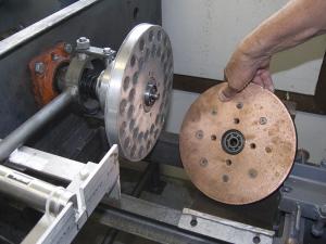The Mag-Trans unit mounts directly to the 5-speed transmission at the bell housing. It consists of a copper disk driven by the DC motor running at its optimum rpm's. There's an air gap between the copper disk and a steel disk attached to the truck's transmission that's fitted with 36 rare earth magnets, each providing about 80 lbs. of attraction.
