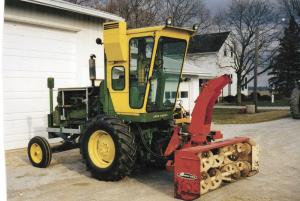 Peck removed everything behind the cab and narrowed the combine to 7 ft. wide. He turned the motor 90-degrees and added weights in the back. He used the combine's 26-in. wheels on front and its smaller ones on back. He installed power steering, a New Holland hydrostat, a Deere 3-pt. hitch and the hydraulic system from a Cockshutt tractor to power a used 80 McCormick snowblower.