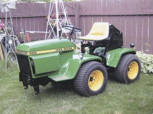 They used most of a Deere 300 model equipped with a 16-hp engine on the front, removing the front axle. The rear end off a 316 model mounts behind it. Both tractors are about 30 years old. The tractor's four wheels are off the original garden tractors, and all of them drive.