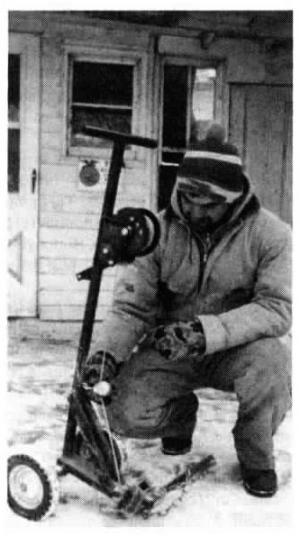 The winch's cable, with a loop of dog chain attached to the end, is used to pull dead pigs onto the cart's platform, which extends 1112 ft. out horizontally from the cart's axle. A Y-shaped holder of square tubing is attached to the platform. This serves as a prop underneath the critter's head or shoulders and helps secure them on the cart. A metal stop on the front of the cart keeps it from tipping forward when dead hogs are being winched onto it.