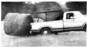 Maurice Bourne, Marquez, Texas, wanted a simple, inexpensive way to retrieve bales from the field and move them to storage. Using a pickup lets him work in comfort and drive at highway speeds back to the farm.