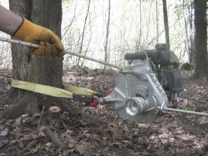Powered by a Honda GXH-50 cc engine, the winch is fast and can be worked continuously. It can be secured to a vehicle's ball hitch or to a tree, rock or other solid object using a polyester sling. That comes in handy for pulling logs or even wild game shot in remote areas.