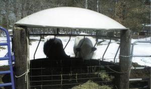 "We came up with the idea because we wanted to protect our grass hay from the weather," says Benson. "We had to drill small drain holes on the dish's outside rim so it wouldn't collect water and serve as a breeding ground for mosquitoes. And every time we wanted to put a round bale in we had to lift the entire feeder up. We tried hinging the dish to one side of the feeder's top rail, but it was too flimsy to work well in the wind."