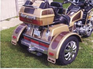 Loren Smith of Kellogg, Minn., didn't want to spend that kind of money. So he converted his 1985 Honda Goldwing motorcycle to a 3-wheeler, adding an axle and a pair of 14-in. wheels off an old mini van on back. The trike features new trailer wheel fenders, painted gold with red pin striping to match the motorcycle.