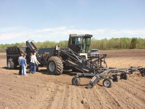 Self-Propelled Rock Picker Sweeps Fields Clean ROCK PICKERS A self-propelled rock picker developed by a central Minnesota farmer can sweep a field clean of 2 to 15-in rocks faster than any rock picker we’ve seen Inventor Mel Aho’s brother Merf now uses the machine to do custom rock picking for as little as $100 per acre depending on field conditions The partners plan to begin marketing the machines but prices have not yet been determined Mel Aho began working on the picker after being frustrated with conventional rock pickers in a particularly rocky field He and a Washington state farmer/friend Perry Gilmour began collaborating on a new-style picker In field tests the unit has removed 1 500 cu yds of rock from 55 acres in 65 machine hours It can make a single pass over 30 to 35 acres in a 10 to 12-hour day and produce 25 to 30 8-cu yd loads of rock a day The RP1000 is a combination of off-the-shelf and fabricated components The base power unit is the New Idea 803C power unit with a Cummins engine Major elements of the picker include gathering arms conveyers and a hydraulic side-dump cart The outriggers unfold from transit position alongside the cab in a V-shaped angle Steel ribbed rollers supported on a wheeled frame churn the soil surface to a depth of 6 in Rocks roll toward the center where they are gathered onto a conveyer It moves them up and into a rolling basket that filters dirt back to the field Rocks larger than 2 in roll to the rear and onto a second conveyer that deposits them in a trailing side-dump cart Aho explains that being able to unload to a dump truck for transport to field edges allows him to keep moving in the field Contact: FARM SHOW Followup Merf Aho ph 603 365-7183; merf@therockpicker com; www therockpicker com