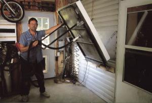 One side of the box hinges on brackets fastened to the garage wall. When not in use, the dog bath simply folds up against the side of the wall. A pair of spring teeth off an old wheel hay rake helps make the platform easier to fold up.