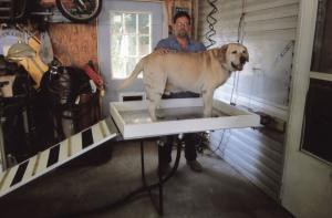 The dog bath consists of a 3 by 4-ft. boxed-in platform with 6-in. high sides and a sink drain in the middle. It mounts on a metal stand about 30 in. off the floor. The dog walks up a tread-fitted gangplank and onto the platform. A flexible hose drain runs from the center of the platform down to the garage’s floor drain.