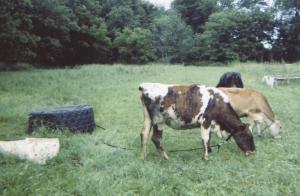 Stoltzfus runs 15-ft. long ropes from the tire to leather collars on the cattle. He has a good pasture behind the barn, and when an area of grass gets short he unties the animals, rolls the tire to a new spot and ties up the animals to graze again.