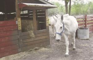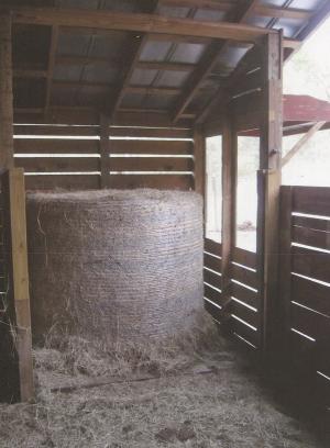 To eliminate that problem, he built a bale-sized compartment into the corner of his barn with two large feed openings to the outside. The bale, which is loaded into the feeder from inside the barn with tractor forks, rests on a wood floor. To keep the mules dry while feeding, Mixon built a small roof over the openings.