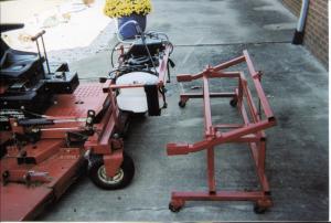 Weed Sprayer Mounted On Mower Deck CROPS Weed Control James Matthews came up with a nifty way to do two jobs at once The King N C farmer mounted a 10-gal tank and pump on a wheeled steel frame that attaches on front of his Graveley zero-turn riding mower It lets him spray weeds with herbicides along buildings and driveways as he mows his lawn “I can spray weeds by activating a nozzle about 1 1/2 ft outside the mower’s left front caster wheel or I can use a handheld wand ” says Matthews whose Gravely is fitted with a 50-in deck The electric sprayer is built in 2 parts One part is a metal subframe that holds the tank electric pump a coiled-up 15-ft long hose and a wand The other part is a 4-wheeled metal “dock” that’s used to hold the subframe and position it for attachment to the deck which rides on a pair of big caster wheels Male plugs on the dock fit into female sockets on the subframe and are pinned together The subframe is contained inside a pivoting mechanism that’s controlled by a vertical spring-loaded metal rod attached to a horizontal bar on one side of the dock To attach the sprayer Matthews pushes the dock up close to the deck and then presses down on the bar to lift the subframe up about a half inch enough to clear brackets above the axle that supports the deck’s caster wheels Then he releases the bar to let the subframe down into place on top of the brackets inserts a pair of metal pins into existing holes in the brackets and backs the dock away Clamp Contact: FARM SHOW Followup James Matthews 1802 Slate Rd King N C 27021 ph 336 969-6675; mortar42v@aol com