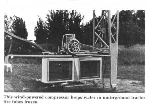 Salvaged hardware was used, including truck differential and axle at the top of the tower. The two-bladed system follows the wind by use of a small turbine for correcting direction. A vertical shaft transfers power to the base of the tower, operating a refrigeration compressor.