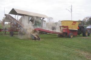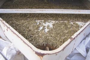 The farmers baled hay and grass at about 10 to 15 percent moisture. Each farmer provided a tractor (90 hp or more) to run a tub grinder and another tractor with an operator to load bales in the grinder and remove “supersacks” (averaging 1,500 lbs.) of finished pellets. The bales are ground in the grinder before going into the pelleter, which makes an average of about 1 ton of pellets/hour, but can make as much as 2 tons/hour. Nothing is added to bind the pellets but steam, which is used when needed. Because grass has less lignin, more die time is needed then with woody materials.