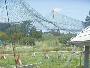 The aviary is 200 by 300 ft. with game bird netting on the sides and over the top. She uses 16-ft. rebar with 4-in. wide plastic caps to hold the netting up. At the sides, hardware cloth dug into the ground around the perimeter keeps out predators. The side netting is attached to the hardware cloth with hog rings.
