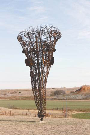 “It has a 20-ft. pipe in the center and an axle off an 18-wheeler, so it’s greasable,” Smith says. The twisted mass of steel has a 1/2-in. rod frame with an assortment of parts welded on to it, including tractor seats, horseshoes and dump rake teeth.