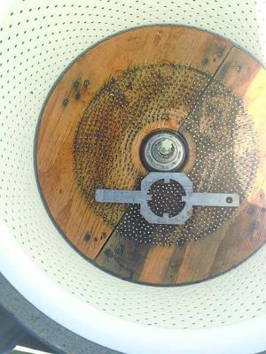 The nails macerate the apples, releasing the juice, which is then spun out of the drum. It drains through the screening and into the waiting pail.