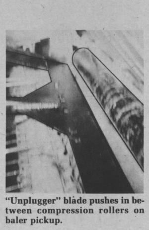 "Hundreds of farmers have been killed or badly injured since big balers went into widespread use in the 1970's and it's still happening," says Gerald Johnson, whose company, Johnson Mfg., has introduced a new hydraulically-operated "unplugger" for big round balers with compression-type feeder rollers. Called Quick-Clean, it consists of a hydraulically-operated scraper the length of the rollers that mounts above the pickup and rollers. When there is a plug-up, the operator lets the rollers keep running. He simply activates a control lever and the unplugger goes to work. The scraper pushes into the rollers, forcing some of the stubborn material through, and cutting some of it off with its blunt metal edge.