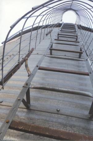 “When I reached my 70’s, I no longer wanted to climb the bin to open the roof door for the elevator. It didn’t feel safe any more,” says Mauler. “The steps were 22 in. apart, and the ladder had no backing. So I added rungs to the ladder half way between the existing rungs, and also added a metal cage - made from a 16-ft. cattle panel - around the ladder to rest my back against. I spent almost nothing to build it.”