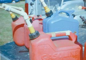 “I have a bunch of plastic fuel cans that originally came with flexible accordian-type spouts, which deteriorated after a few years. I replaced them with 3/4-in. dia. CPVC plastic pipe by cutting off the flex part of the old spout. I left the base of each spout so I could fit a piece of pipe into it. I cut about 3/8-in. off the end of a pipe fitting and slipped it over a piece of 3/4-in. pipe so I could slip it into the old nozzle stub. I glue that into the old nozzle. Then add a 45 degree “L” and another short pipe and a pipe cap on the end. You can glue the pipe together because the entire assembly will still pivot on the cap. This cheap do-it-yourself nozzle doesn’t leak.”
